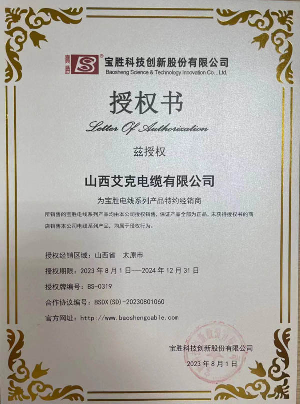 寶勝電纜山西銷售中心山西艾克電纜有限公司是寶勝電線電纜的官方授權經(jīng)銷商,授權編號BS-0319。專業(yè)經(jīng)營寶勝牌電線電纜,包括電力電纜,控制電纜,橡套電纜;硅橡膠電纜,氟塑料電纜,補償電纜,各種阻燃,低煙無鹵,耐火,及高溫電線電纜;架空絕緣電纜,船用電纜,礦用電纜,機車車輛電纜,計算機電纜,儀表信號電纜,高壓交聯(lián)電力電纜,低壓輻照交聯(lián)電力電纜,低壓輻射交聯(lián)控制電纜,低壓輻照交聯(lián)電纜,預分支電纜,1E級K3類核電站電纜,承荷電纜,自控溫電纜,布電纜,鋁絞線,和鋼芯鋁絞線等電線電纜產(chǎn)品。產(chǎn)品備有大量現(xiàn)貨、各種型號顏色齊全、支持配送。